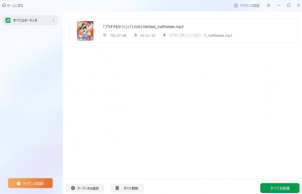 Step 2.追加されたら、「修復開始」ボタンを押して修復処理を開始します。MP3ファイルのサイズや損傷の程度によって、しばらく時間がかかります。
