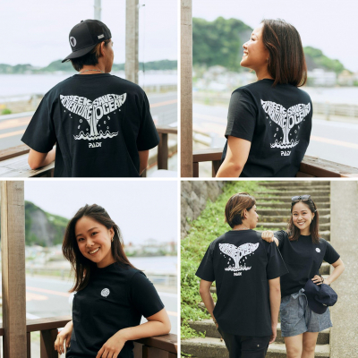海からインスピレーションをもらいながら、独自の技法でオリジナリティ溢れるアートを描くYURIE氏が、今回PADIが掲げるミッションの「Seek Adventure, Save the Ocean」をホエールの力強いテールに込めたデザインを作り上げました。廃業網からリサイクルされた素材を使用し、まさにPADIのミッションを体現したTシャツとなっています。