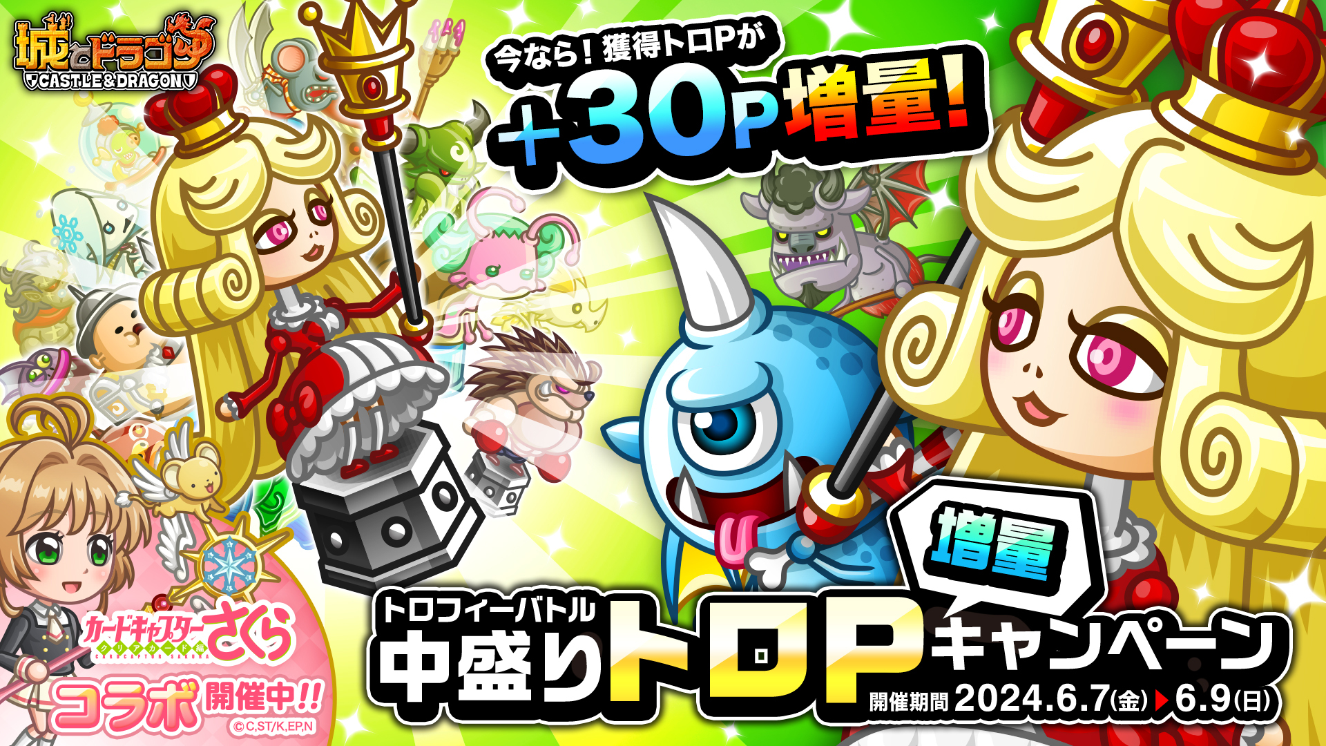 6月7日(金)から「トロフィーバトル」が開催されます。今回は獲得できる“トロP”が通常よりも増える「中盛りトロP増量キャンペーン」を同時開催!また、現在対象ユーザーに最大10,000ルビーや金の友トレ倶楽部などが贈られる「おかえり&新人キャンペーン」も開催中!この機会に、ぜひ城ドラをプレイしましょう!