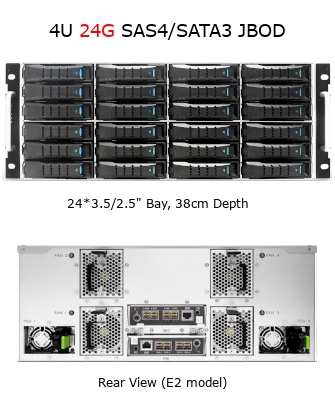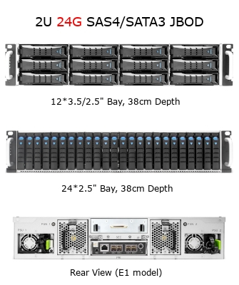 3.5/2.5インチドライブ対応の「J22012SBR」および「J42024SBR」シリーズと、2.5インチドライブ対応の「J22024SBR」シリーズが可能で、それぞれ1台のSAS4エキスパンダーを搭載したE1モデルと、2台のSAS4エキスパンダーを搭載したE2モデルとが用意されています。