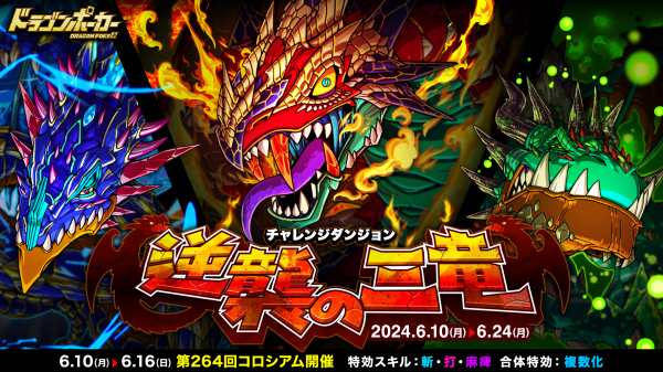 株式会社アソビズム(本社:東京都千代田区、代表取締役:大手智之)は、App Store・Google Playにて好評配信中のリアルタイム合体カードバトル『ドラゴンポーカー』で、2024年6月10日(月)より復刻チャレンジダンジョン「逆襲の三竜」を開催いたします。