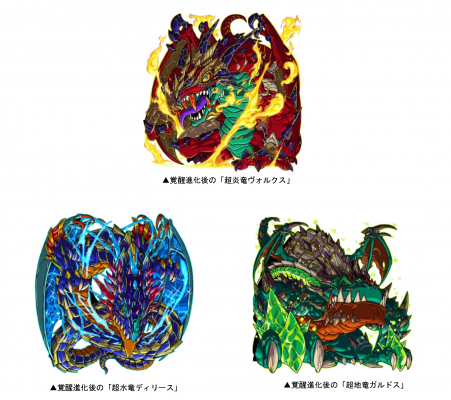 6月10日(月)より、チャレンジダンジョン「逆襲の三竜」が復刻開催いたします。本ダンジョンでは、覚醒した「超炎竜ヴォルクス」「超水竜ディリース」「超地竜ガルドス」のうち1体が日替わりで登場し、プレイヤーの前に立ちはだかります!フレンドと協力して強力なボスを倒し、レアアイテムを手に入れましょう!