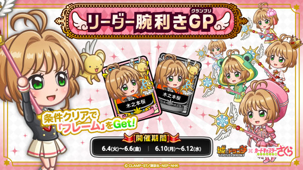 6月10日(月)より、アニメ『カードキャプターさくら クリアカード編』コラボ限定キャラ「木之本桜」をリーダーにして「キャラフレP」を競う、「リーダー腕利きGP」の2回戦目が開催!ランキング上位者や条件を達成した方には、コラボ限定「キャラフレーム」が贈られます。「木之本桜」をリーダーにして期間中のリーグに挑みましょう!