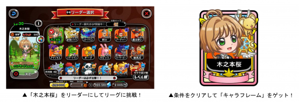 コラボ限定キャラ「木之本桜」をリーダーにしてリーグに挑む「リーダー腕利きGP」を開催いたします。バトルに勝利してより多くの「キャラフレP」を獲得したランキング上位者や条件を達成した方には、コラボ限定「キャラフレーム」が贈られます。