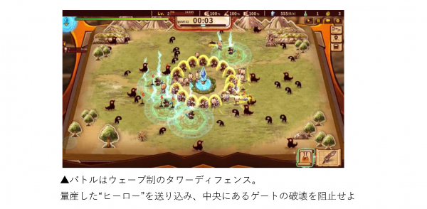 ビルドの時間が終了すると、いざバトル開始!生産してポータルに送られた“ヒーロー”たちがフィールド中央のゲートから召喚され、自動で戦ってくれます。プレイヤーも眺めているばかりではなく、マウスの左クリックで応戦することが可能です。