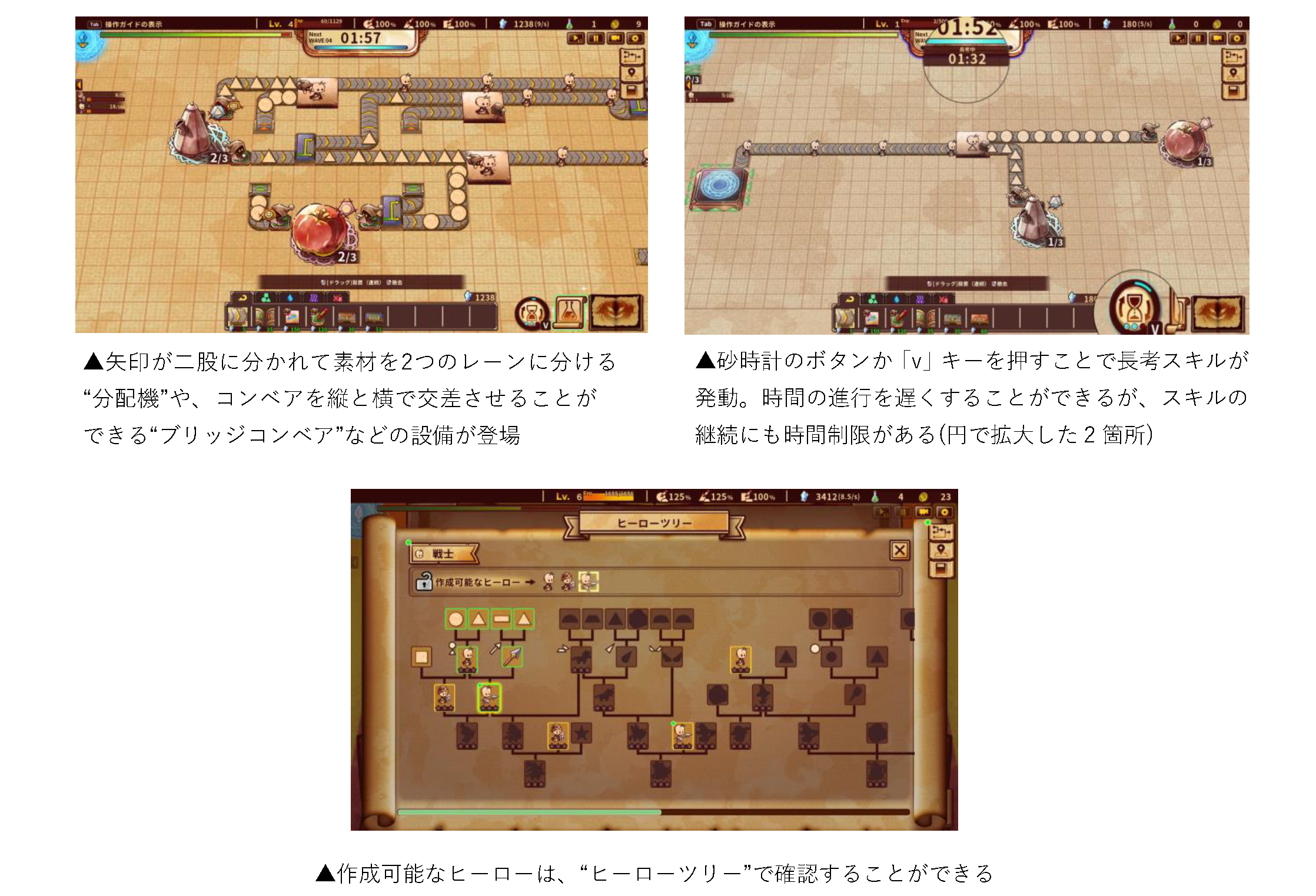 工場ビルドパートでは、遊ぶごとにランダムで生成されるスクロール上に、マナを消費しながら設備を整えていきます。素材が詰まっているコンベアに分配機をつなげて流れをスムーズにしたり、コンベアを交差させるためにブリッジコンベアを使ったり。設備の取り消しはマウスの右クリックで簡単に行え、消費したマナも返却されます。失敗を恐れずどんどん設置し、“ヒーロー”を量産!効率よくポータルへ運んで、バトルフィールドへ召喚しましょう。なお、制限時間内でのビルドが求められますが、時間の進行を遅くできる長考スキルや、完全に時間を止めてビルドに集中できる無制限モードもありますので、ぜひ活用してみましょう。