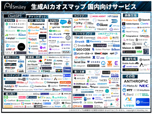 ChatGPTをはじめとする生成AIサービス活用推進の一環として生成AIのサービスをまとめた「生成AIカオスマップ 国内向けサービス」を公開しております。掲載数は258製品です。
