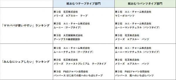 3. 「ママパパが使いやすい」ランキングは、実施したアンケート内の「はかせやすさ」等の項目得点が高かった製品に授与