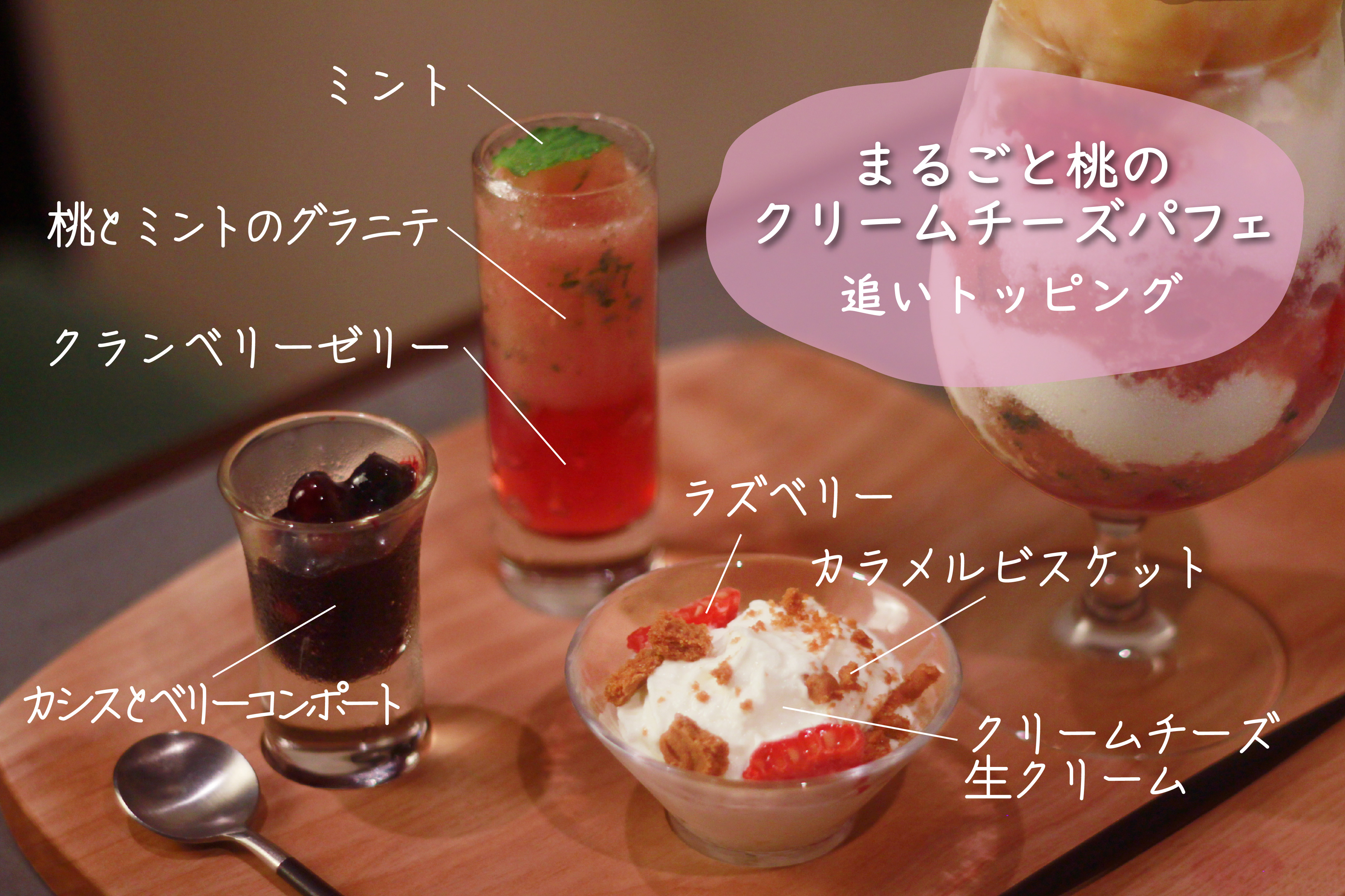 喫茶パステトの定番となった追いトッピングには、「桃とミントのグラニテ&クランベリーゼリー」、ラズベリーとカラメルビスケットがかかった「クリームチーズ生クリーム」、「カシスとベリーのコンポート」などをご用意。