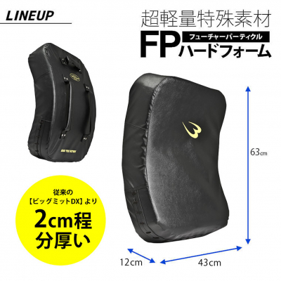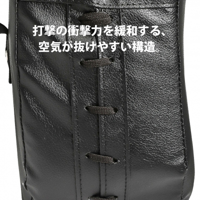 従来【ビッグミットDX】より2cmほど分厚くなります。また硬度を高めにお作りすることで、重量級のキックにも耐え得る優れものです。表面素材はサンドバッグと同じ特殊強化レザー。内部衝撃吸収材は超軽量特殊素材「FP(フューチャーパーティクル)ハードフォーム」を用いており、打ち込みトレーニングに最適です。また打撃面にはハードチップを使うことで、人体の硬さの違いをリアルに再現。試合感覚で練習できます。グリップや握り具合から、蹴るほどに相性が良くなるキックミット。多くのキックボクシングジムや総合格闘技道場、空手道場で使用されています。