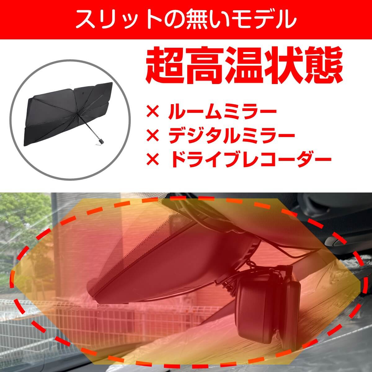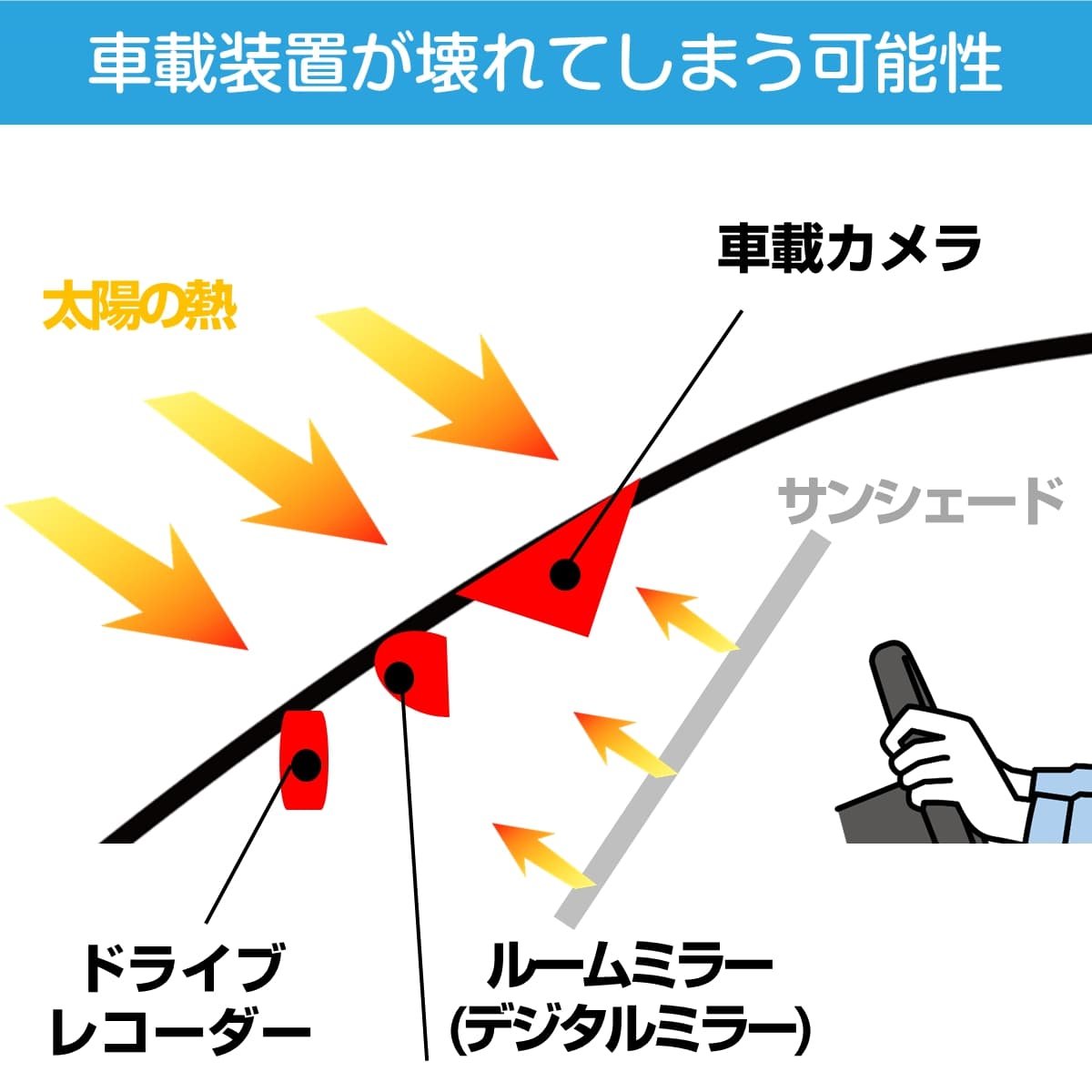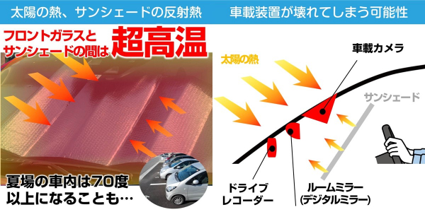 ※ドライブレコーダーがフロントガラスとサンシェードの間に挟まれてしまうと太陽の熱で壊れてしまいます。そのためフロントガラスとドライブレコーダーの間にサンシェードを設置してください。