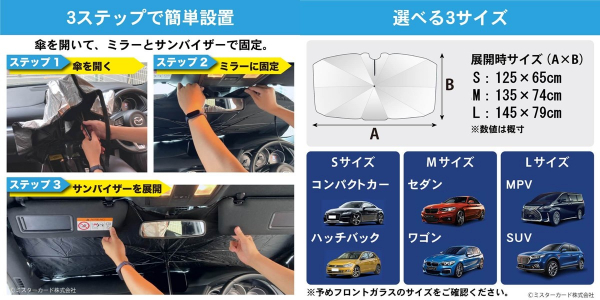◎【 3ステップで簡単設置 】サッと傘を開いて、ルームミラーとサンバイザーに固定すれば設置完了。