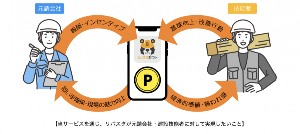 当サービスは、元請会社の判断で建設技能者に対し簡単にポイントを付与することができます。建設技能者は、元請会社の設定する条件を満たすこと(例:安全講習会への参加、日々の入退場認証やCCUS-建設キャリアアップシステム-カードのタッチ、改善提案を行うこと等)で、当アプリを通じてポイントを受け取ることができます。ポイント付与の方法はシンプルで、まず元請会社はポイント付与の条件を自身の裁量で自由に設定します。例えば、リバスタが提供する建設現場施工管理サービス「Buildee入退場管理」の就業履歴データと連携させることで、入場者に一律でポイントを自動付与するなど、きめ細かな対応が可能です。受け取ったポイントは建設技能者が個人のPayPayアプリ上で、PayPayマネーライトとして提携サービスや加盟店での決済に用いることが可能です。利用者からは「ノベルティなどをもらうより、自分で好きなものを買える仕組みがうれしい」と高い評価を得ています。