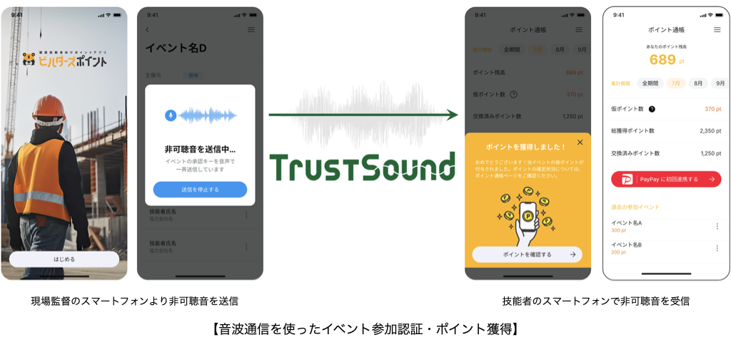 株式会社スマート・ソリューション・テクノロジー(本社:東京都新宿区、代表取締役:山川 進、以下 SST)は、独自技術の音波通信「TrustSound(R)」が2024年6月より株式会社リバスタ(本社:東京都江東区、代表取締役:高橋 巧、以下リバスタ)の建設技能者向けポイントサービス「ビルダーズポイント(以下 当サービス)」に採用されたことをお知らせいたします。SSTの独自技術「TrustSound(R)」で、集団イベント等に参加する技能者がスマートフォンで人の耳には聴こえない非可聴音を受け取ることにより一斉にポイント付与することが可能になります。