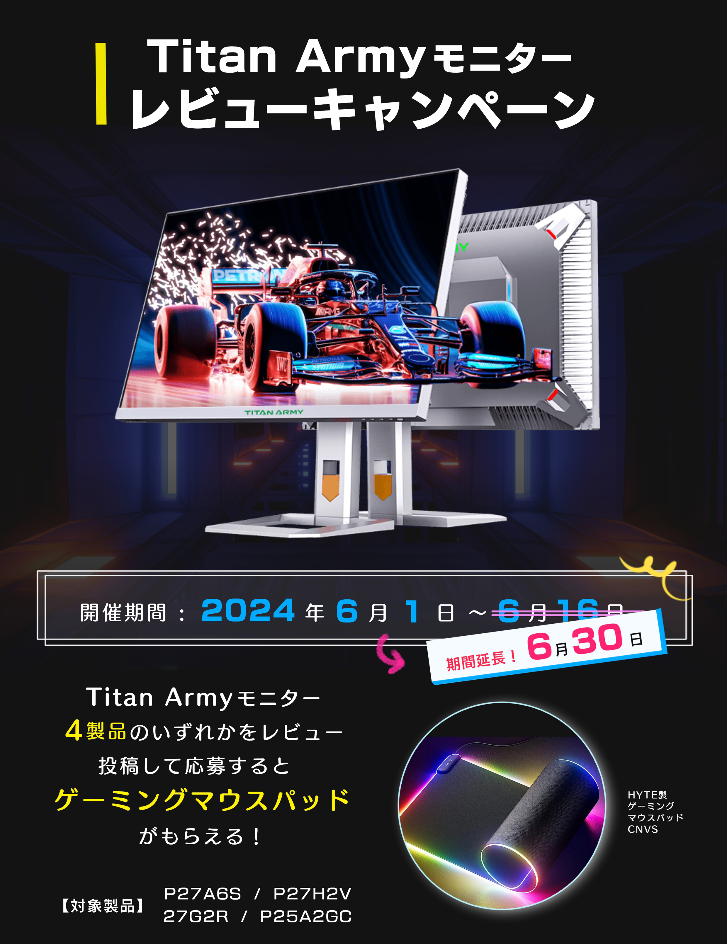 株式会社リンクスインターナショナル(本社:東京都千代田区、代表取締役:川島義之)は、絶賛発売中のTitan Army 製ゲーミングモニター4製品のうちいずれかをレビューすると、HYTE製ゲーミングマウスパッド「CNVS」がもらえる「Titan Army モニターレビューキャンペーン」を、好評につきレビューキャンペーン期間を2024年6月30日(日)まで延長いたします。