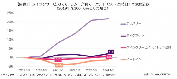 2024年1-3月計のクイックサービスレストラン(ファストフード、カフェ、ベーカリー、洋菓子・フルーツパーラー店を含む)は、夕食時間帯(18-21時)が非常に好調で、客数(食機会数)は2019年同期比10%増、前年同期比で11%増でした(図表1)。クイックサービスレストランの同時間帯の客数は2021年同期には11%減まで減少しましたが、回復が進み、2024年1-3月にはコロナ前より成長しました。コロナ禍で大きく成長したデリバリーの維持に加え、テイクアウトの好調(2019年同期比21%増)とイートインの回復が寄与しました。