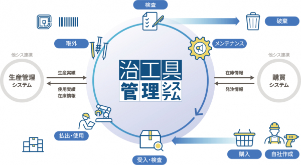 治工具や金型を個体毎に識別し、精密な管理を実現するシステムです。購入から使用、メンテナンス、廃棄に至る一連のライフサイクルを通して、使用実績や在庫数を一元的に管理します。適正な在庫数の維持や、生産工程との紐付けにより、製造プロセス全体の改善に貢献します。