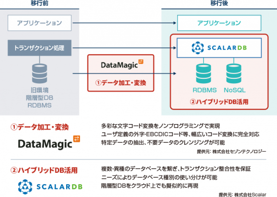 「メインフレームモダナイゼーションサービス」では、レガシーアプリケーション資産の大幅な修正を伴わずに、最適な移行方式により段階的なシステムの刷新が可能となります。また、データベースの移行・最適化については、データ加工・データ変換処理をノンプログラミングかつ低価格で実装可能なツール「DataMagic」に加え、複数のデータベース間を繋いで整合性を保証する汎用的なトランザクションマネージャー「ScalarDB」を組み合わせることで実現しています。