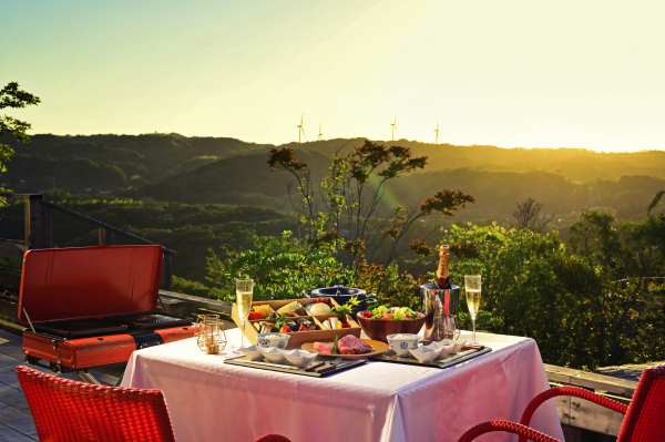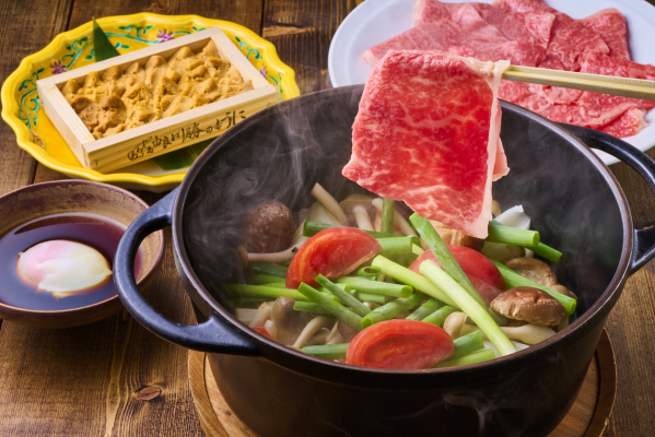 食材は、淡路島の年間200頭ほどしか取れない淡路ビーフ、新鮮さゆえ提供ができる「逆さうに(由良産のうに)、淡路島産の玉ねぎ、トマトをなどたっぷりの野菜を使った「淡路ビーフ山海トマトすき焼き」をはじめ、夏季限定「極上BBQ」のメニューもお選びいただけます。