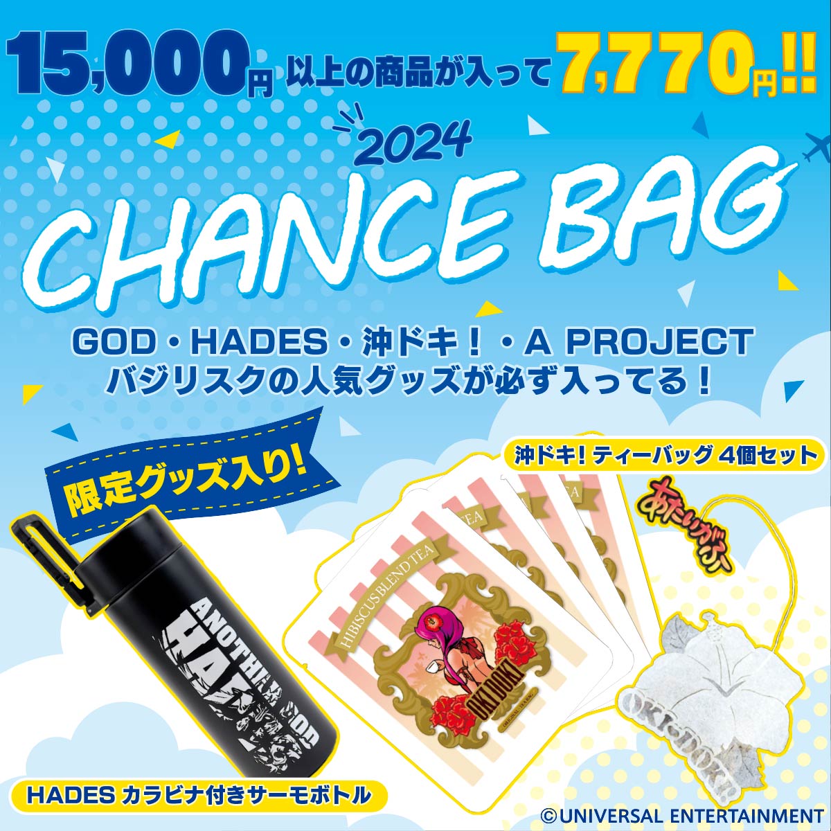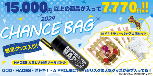 そして福袋限定グッズとして「HADESカラビナ付きサーモボトル」と「沖ドキ!ティーバッグ4個セット」をご用意しました。