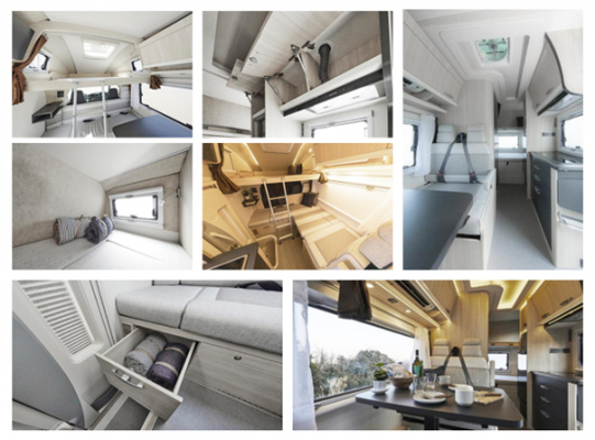 明るい色合いと落ち着きを両立させたデザインの室内には、対面式の広いダイネットスペースを採用。スライド式バンクベッド、後部二段ベッド、キッチン、電子レンジ、冷蔵庫等が装備されており、ファミリーにも使いやすいレイアウトとなっています。エアコンやFFヒーターに加え床暖房も完備しているため、年間を通じて乗車が可能。ソーラーパネルに併せてサブバッテリー(リチウムイオンバッテリー2個)を搭載しており、インバーターも積んでいるため外部充電も行えます。