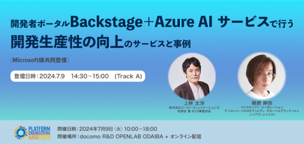 株式会社エーピーコミュニケーションズは、2024年7月9日にdocomo R&D OPENLAB ODAIBAで開催される「Platform Engineering Kaigi 2024」にPlatinumスポンサーとして協賛し、当社取締役 兼 ACS事業部 事業部長の上林 太洋が、マイクロソフト・コーポレーション デベロッパープロダクティビティ グローバルブラックベルト シニアスペシャリストの柳原 伸弥 氏と共同登壇することをお知らせいたします。