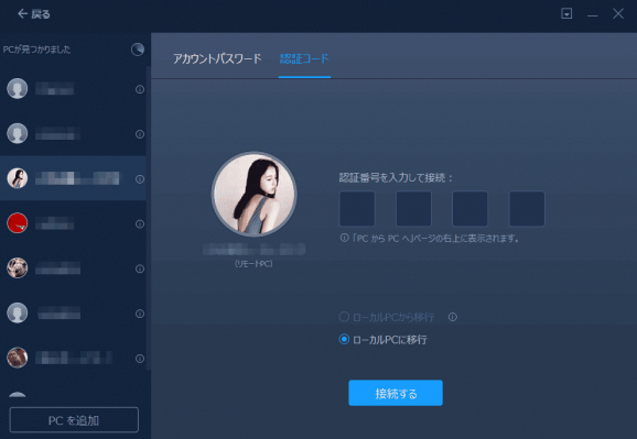 ステップ2.移行先のPCに接続する前に、そのアカウントパスワードまたは認証コードを入力する必要があります。移行先のPCの「PCからPCへ」メイン画面の右上に表示される認証コードを確認します。接続完了後、転送方向を指定し、「接続する」をクリックします。
