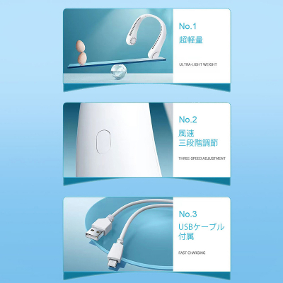 風量は3段階調節可能!USB充電式で簡単充電!小型軽量で首への負担も少ない。