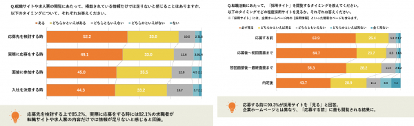 転職サイトや求人票の情報量に関する調査では、情報の不足感を感じる回答がいずれのフェーズにおいても多くなる結果に。特に「応募先を検討する」タイミングでは、85.2%が転職サイトや求人票の情報だけでは不足していると回答しました。