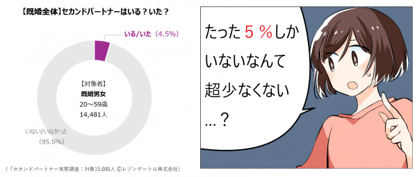調査対象の全既婚者14,481人中、「セカンドパートナーがいる/いた」と回答したのは4.5%にあたる657人となりました。