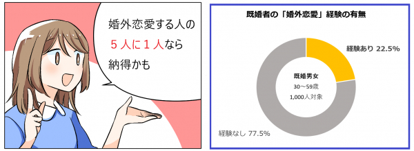 ただし、セカンドパートナーを持つ人なんて希少生物か?と言うと、そうでもありません。同じくレゾンデートル株式会社が2023年に行った「婚外恋愛に関する実態調査」では、「婚外恋愛の経験あり」の既婚者は22.5%ですから、おおよそ5対1くらいの割合になります。