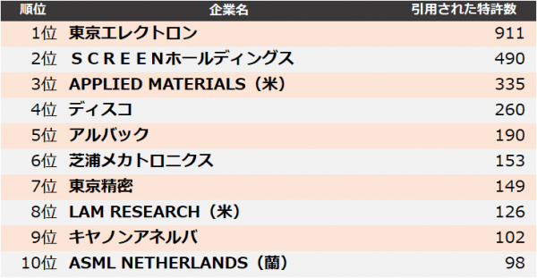 集計の結果、2023年に最も引用された企業は、1位 東京エレクトロン、2位 SCREENホールディングス、3位 APPLIED MATERIALS(米)となりました。