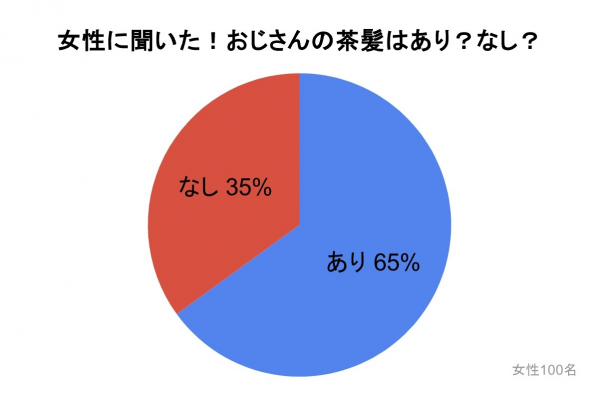 女性を対象に「おじさんの茶髪はあり?なし?」のアンケート調査を行ったところ、『あり』が65%、『なし』が35%という結果となり、おおよそ3人に1人はおじさん(中年男性)の茶髪に対してネガティブな印象を持っていることがわかりました。