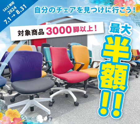 “SUMMERチェアSALE”では3,000脚以上のリユースオフィスチェアを対象に、5%オフから最大で半額の価格にてご提供いたします。