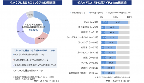 ◆毛穴ケアのために使用しているスキンケアのアイテムでは、「クレンジングオイル」の使用率が最も高く、次いで「化粧水(ローション)」、「洗顔クリーム/フォーム」などと続いている。また、毛穴ケアの効果実感については、「オイル」使用者の実感度合いが最も高い。