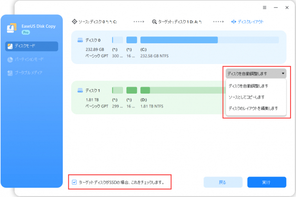 ステップ2. ターゲットディスクのM.2 SSDを選択します。ディスクの自動調整などにも対応可能です。さらに、「ターゲットディスクがSSDの場合、これをチェックします」オプションを選択します。