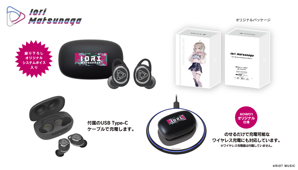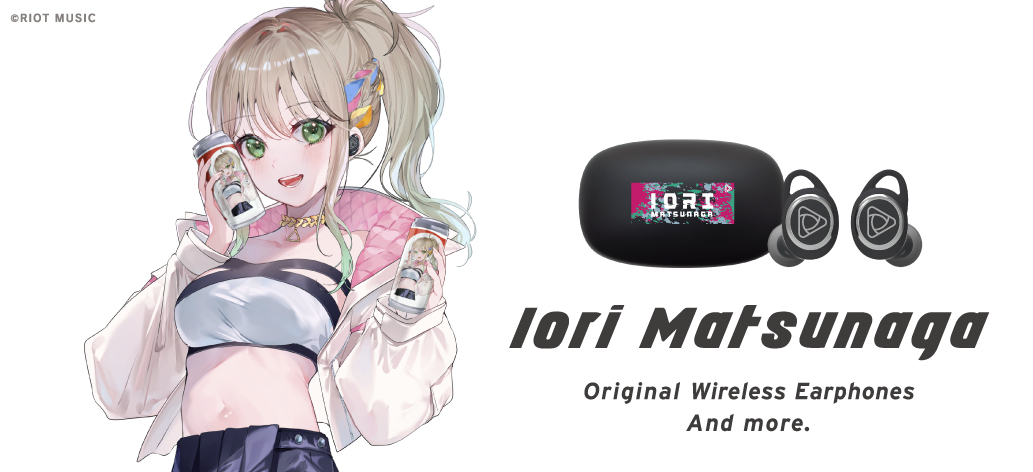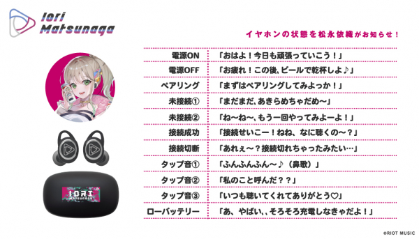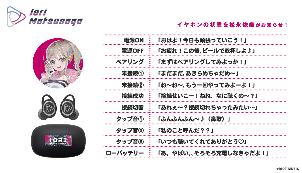 本コラボレーションモデルは、RIOT MUSIC、バーチャルミュージックレーベル「Blitz Wing」所属の『松永依織』特別コラボモデルとして、充電ケース天面には「松永依織」をイメージしたデザインを印刷、左右ハウジングにはシンボルマークをモチーフにしたレーザー加工をし、起動時にLED点灯します。音声ガイダンスは「松永依織」による録り下ろしボイスを搭載。電源オンやオフ、ペアリング時やタップ音等、計11ワードの内容となっており、パッケージのイラストはイヤホンと「松永依織」をイメージしたオリジナルの描き下ろしです。