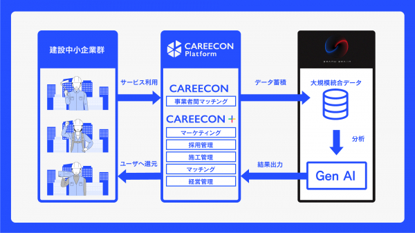 「BRANU BRAIN」は、当社の「CAREECON Platform」を利用する5,000社以上の建設中小企業の保有データを秘匿性を担保したうえで統計データとして集約。単一ではなく企業群として不足情報を補完し合うスケールメリットを活かすことで、大企業を上回るデータ量による高精度・高感度AIモデルを構築します。
