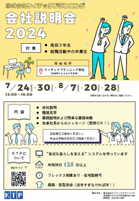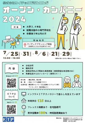 茨城県ひたちなか市で社会インフラのソフトウェア開発事業を手掛ける株式会社ケイテックプランニング(本社:茨城県ひたちなか市、代表取締役社長:安 桂一郎、以下 当社)は、2024年7~8月に高校生、専門学校生、大学生および卒業生を対象に開催する「会社説明会」「オープンカンパニー」への参加募集を開始いたしました。