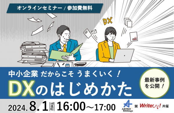 株式会社ライトアップ(本社:東京都渋谷区、代表取締役社長:白石崇、以下ライトアップ)と、ASTRO Siblings株式会社(本社:東京都渋谷区、代表取締役:平沼 智康、以下ASTRO Siblings)は、中小企業・小規模事業を対象にしたDXを推進していくためのオンラインセミナーを8月1日(木)16時から開催いたします。