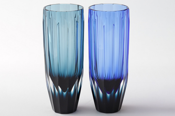 被せガラスに大胆なカットを施した、ソリッドな印象のグラスです。淡く発色させた色ガラスを厚く被せ、カットする深さや幅によって、豊かなグラデーションが自然と生まれ、光がさすとカット部の濃淡が際立ち、水を入れると美しく揺らぎ、奥行きのある幻想的な世界が広がります。