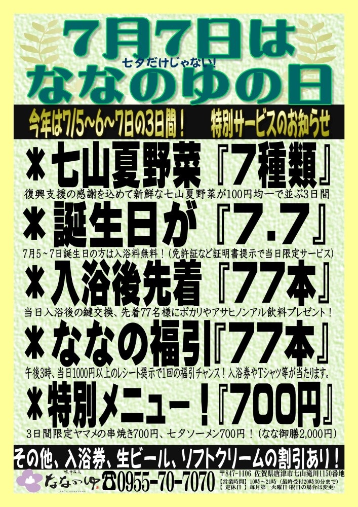 ◎3日間に入浴された方は、レシート持参で七山にある素敵なお店7店舗で7月いっぱい、七夕祭りのコラボサービスを受けられます。