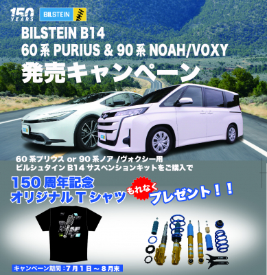この度株式会社阿部商会(社長 阿部文保)では日本総代理店であるドイツBILSTEIN(ビルシュタイン社)よりトヨタプリウス60系用とトヨタノア・ヴォクシー90系用B14車高調整式サスペンションの新発売を記念して「BILSTEIN B14 60系 PURIUS & 90系 NOAH/VOXY用発売記念キャンペーン」を実施いたします。期間中新製品トヨタプリウス60系用とトヨタノア・ヴォクシー90系用B14車高調整式サスペンションをお買い上げの方にBILSTEI社150周年記念オリジナルTシャツをもれなく1枚プレゼントいたします。ご購入は全国ビルシュタイン取扱店まで。キャンペーン期間は2024年7月1日より8月末日。