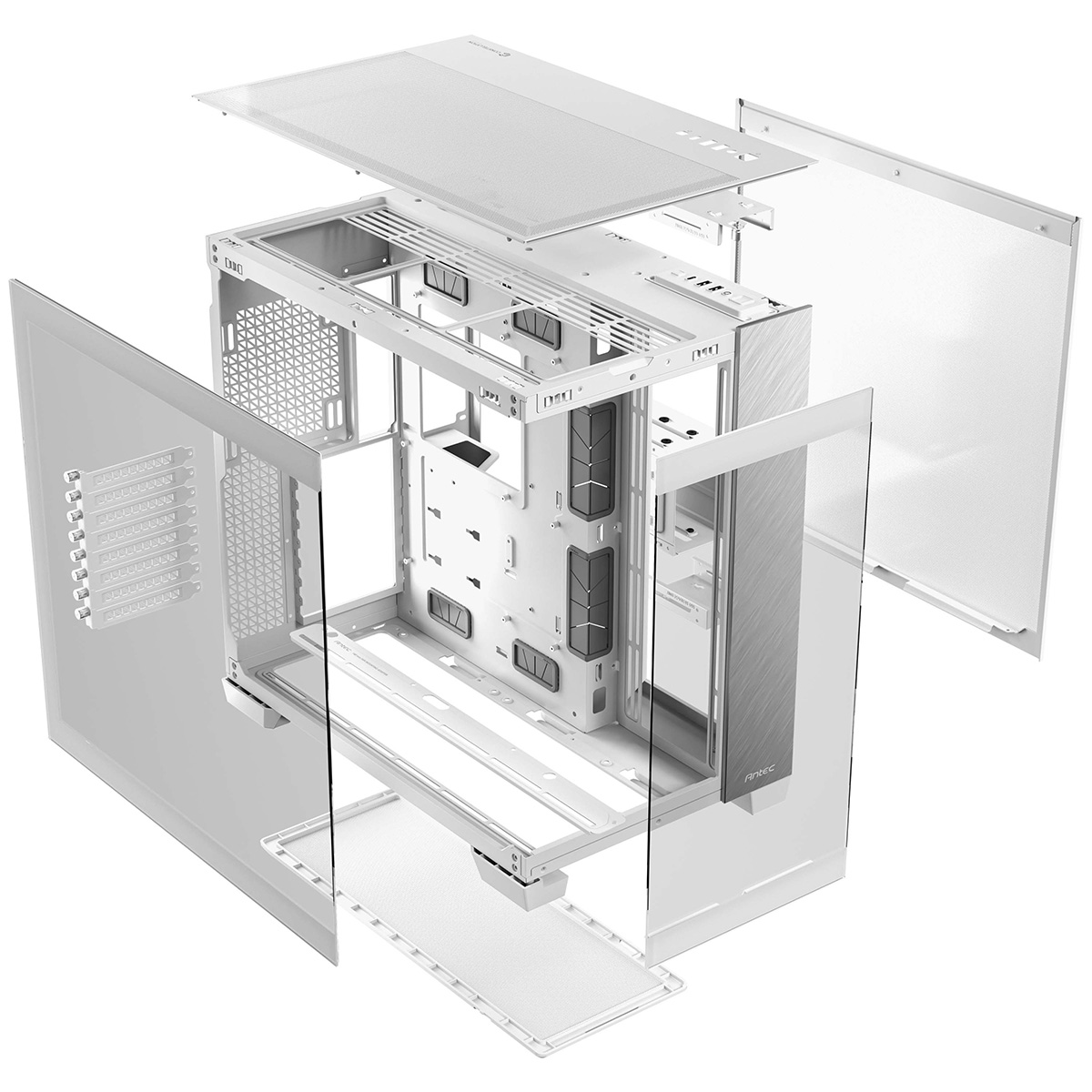 Constellation C8 Aluminum Whiteは、フロントとサイドに強化ガラスパネルとアルミ製のフロントパネルを搭載し、右側はメッシュのスチールパネルを搭載したE-ATXマザーボード対応のフルタワーPCケースです。最大120 mmファンを10基搭載することができ、左側の強化ガラスパネルは表面にネジ穴を設けないことで美観と耐久性を両立します。最大で360 mmの大型ラジエータにも対応し、最大440 mmを確保した拡張カードスペースと、高さ175 mmまでのCPUクーラーを搭載でき2.5インチ専用ベイを4台、3.5インチベイを2台備えています。
