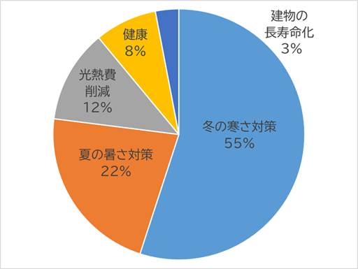 「断熱性を高めることで最も期待したこと」(選択制)に、半数以上の55%が「冬の寒さ対策」と回答。続いて「夏の暑さ対策」が22%という結果になりました。夏の暑さよりも冬の寒さへの対策を重視していることが伺えます。