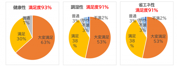 断熱性以外で最も満足度が高かったのが、健康性(ヒートショック対策、ダニ・カビ予防)でした。「部屋間の温度差が気にならない」「どの部屋にいても快適に過ごせる」「部屋中が暖かい」と住宅内で温度差を感じない点が評価されていました。また、温度差を作らず結露の発生を抑えられることから、ダニ・カビの予防にもつながり、健康被害を抑えます。いずれも断熱性を高めた結果によるものですが、健康への影響を体感されている方が多いことがわかりました。