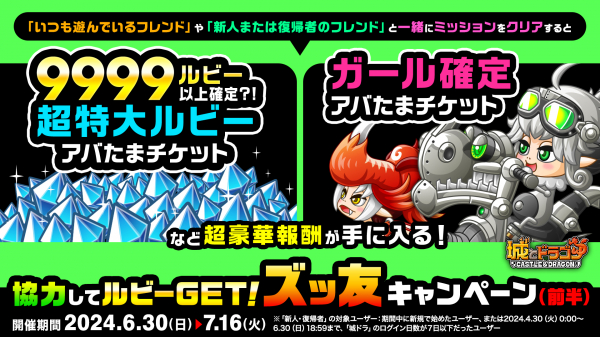 最大14000ルビーや30000CP、ドラゴンメダル500枚、「金の友トレ倶楽部」15日間無料がプレゼントされます。