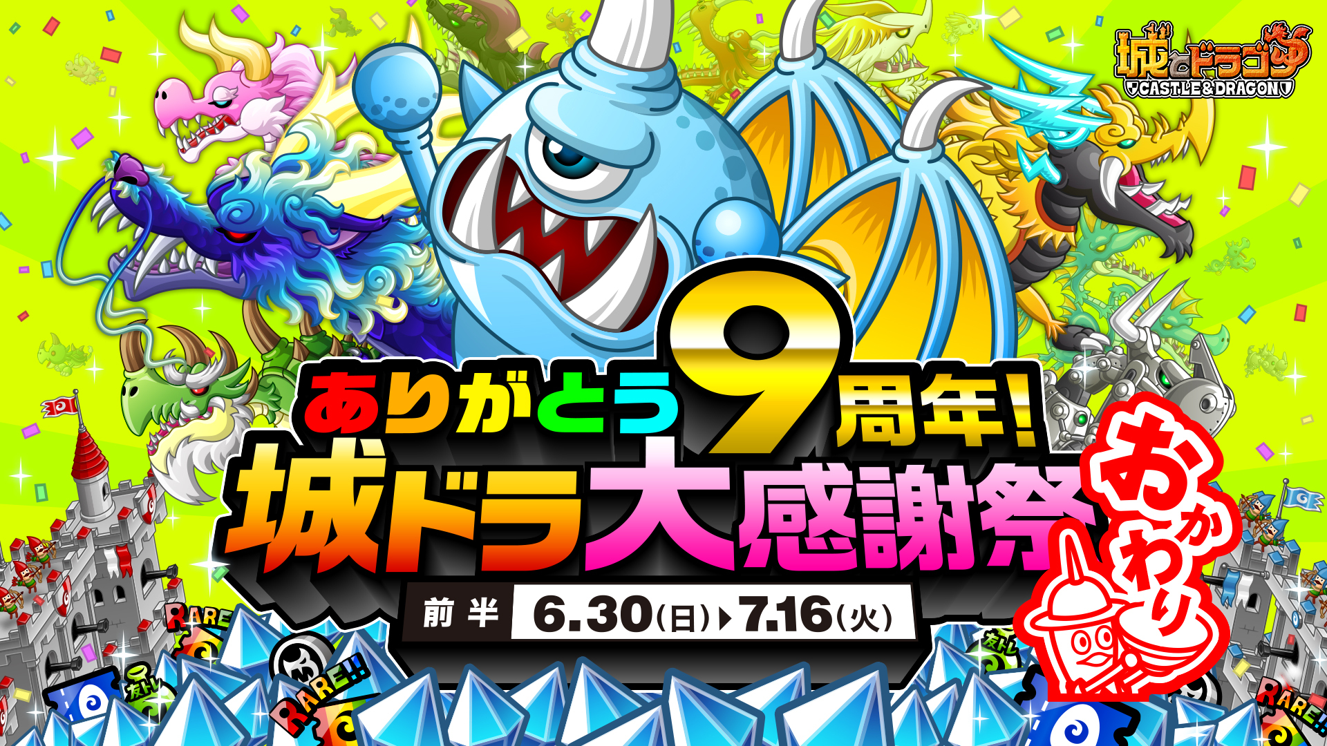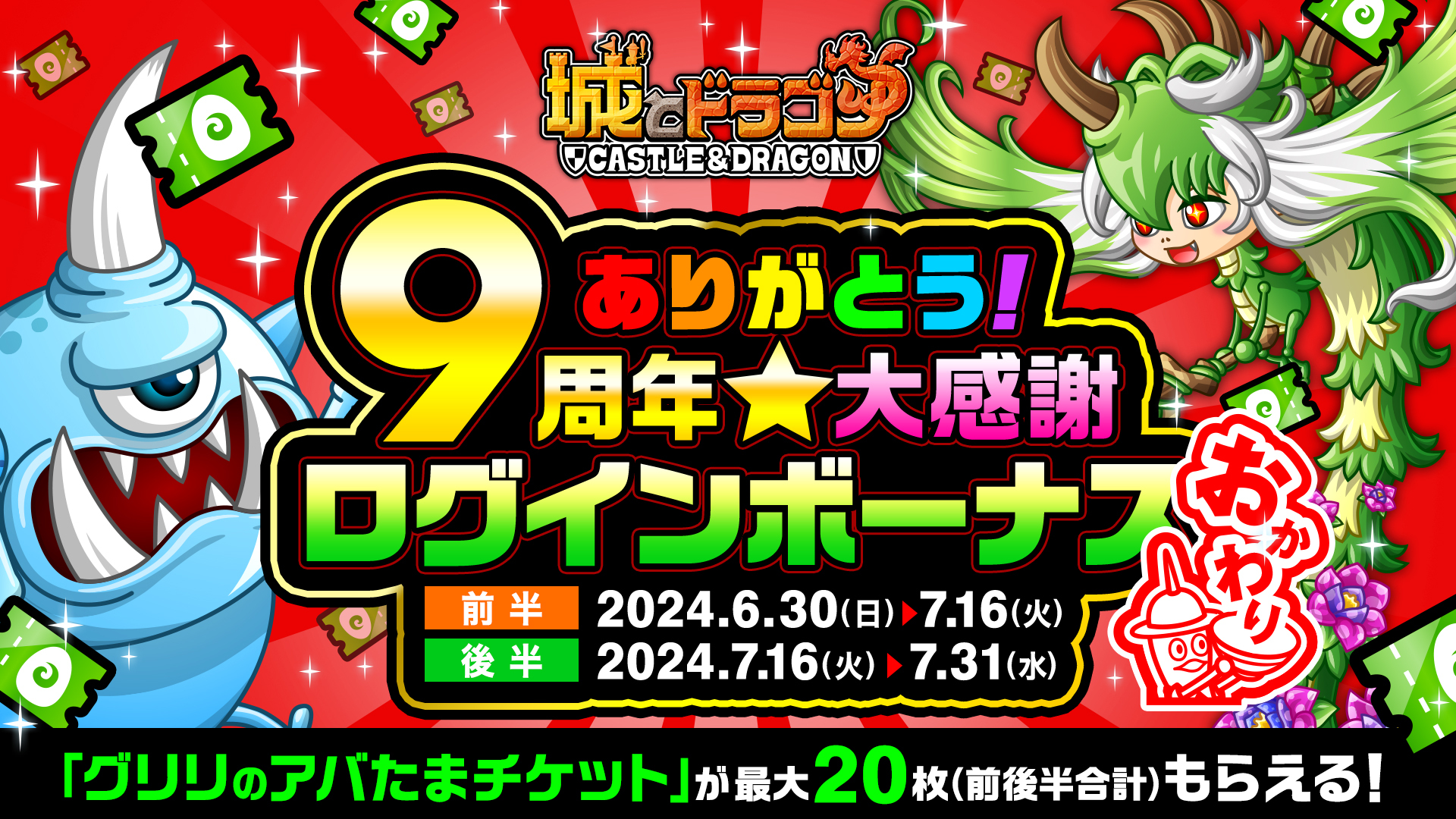 2024年2月に『城とドラゴン』で9周年を記念して開催された大盤振る舞いキャンペーンが再び!「ありがとう9周年!城ドラ大感謝祭 おかわり(前半)」を6月30日(日)より開催中です。特別なログインボーナスやミッションはもちろん、1日1回最大“9999ルビー”が当たる!?「9周年ルビーアバたま」や、最高“99999ルビー”と特別なフレームが当たる「大感謝祭!城ドラ宝くじ」も実施!さらに「協力してルビーGET!ズッ友キャンペーン」などの新イベントも!この機会にぜひ『城とドラゴン』でお楽しみください!