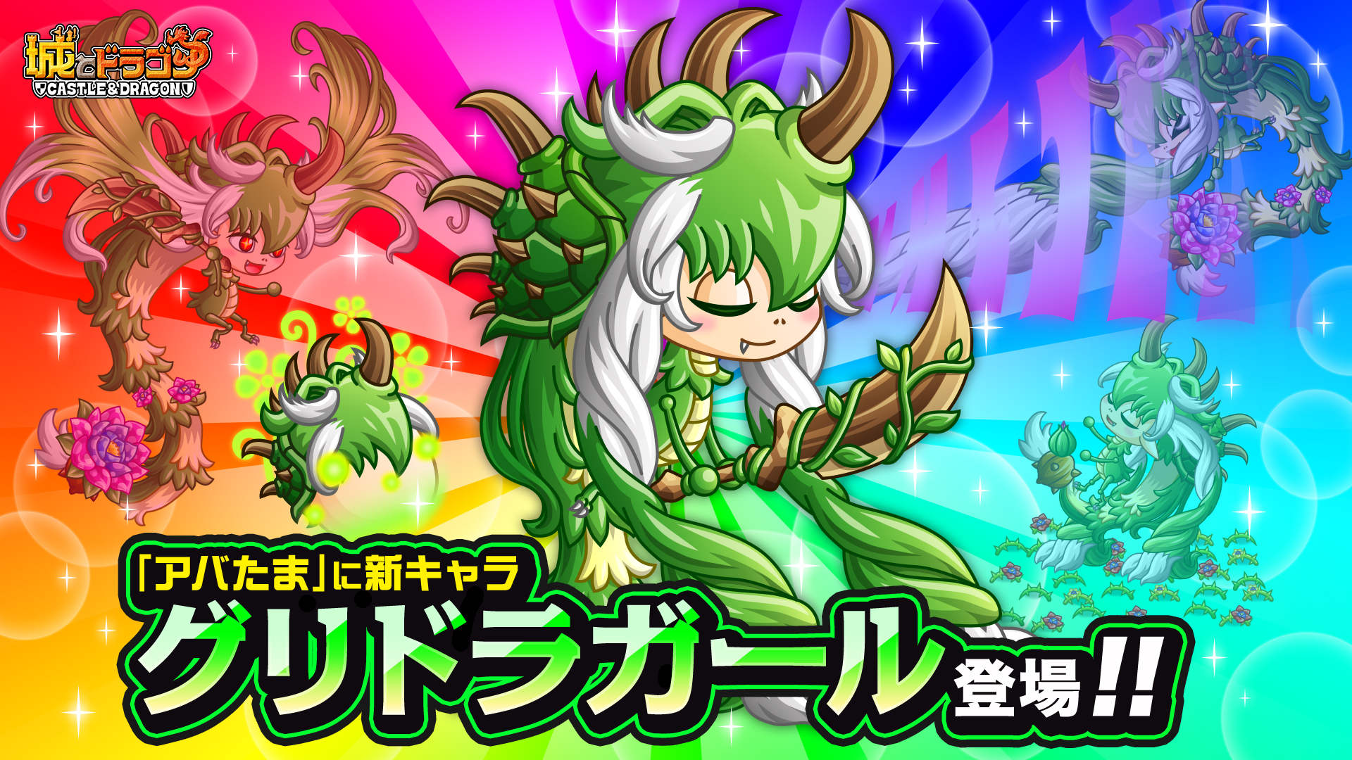 開催期間中、ゲームにログインすると“グリリのアバたまチケット”が最大10枚プレゼントされます。“グリリのアバたま”からは新キャラ「グリドラガール」や、キャラ専用お着替え、育成アイテムなどが手に入ります。