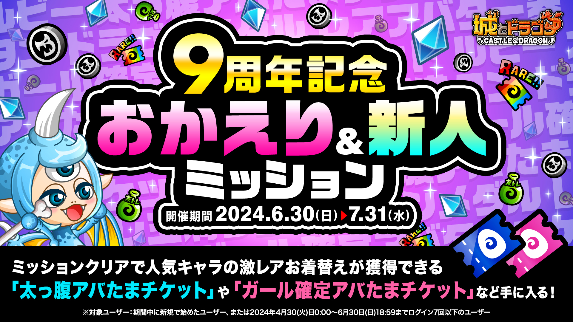 期間中に新規で城ドラを始めたプレイヤー、または2024年4月30日(火)0:00~2024年6月30日(日)18:59までログイン回数が7回以下のプレイヤー